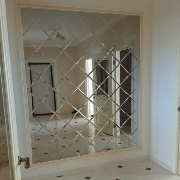 Использована зеркальная квадратная и треугольная плитка с фацетом.